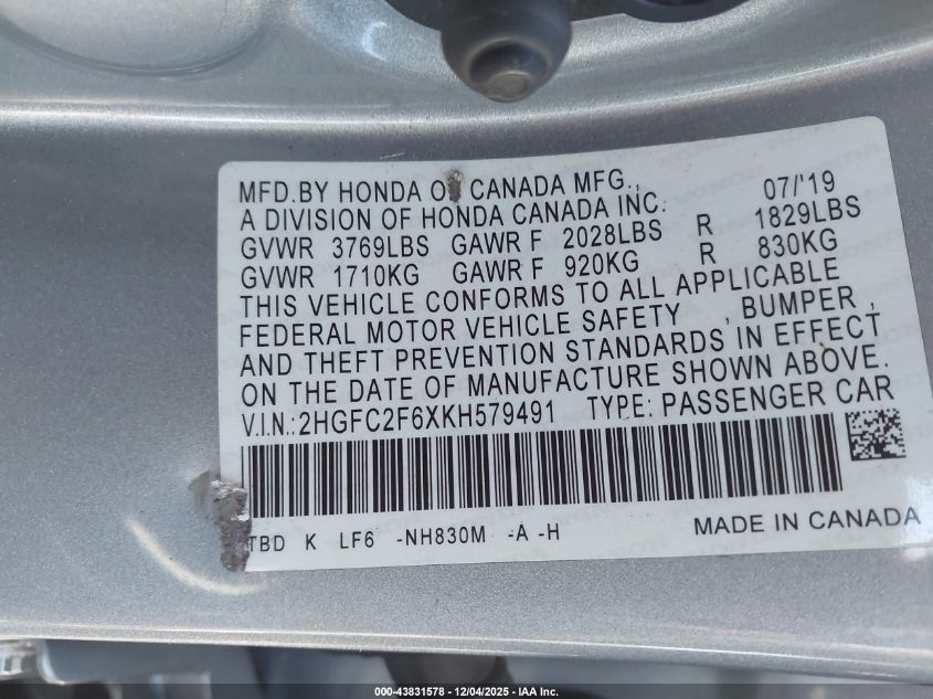 2019 HONDA CIVIC 2019 року Бензин, 2.0, Передний привод, vin - 2HGFC2F6XKH579491 из США