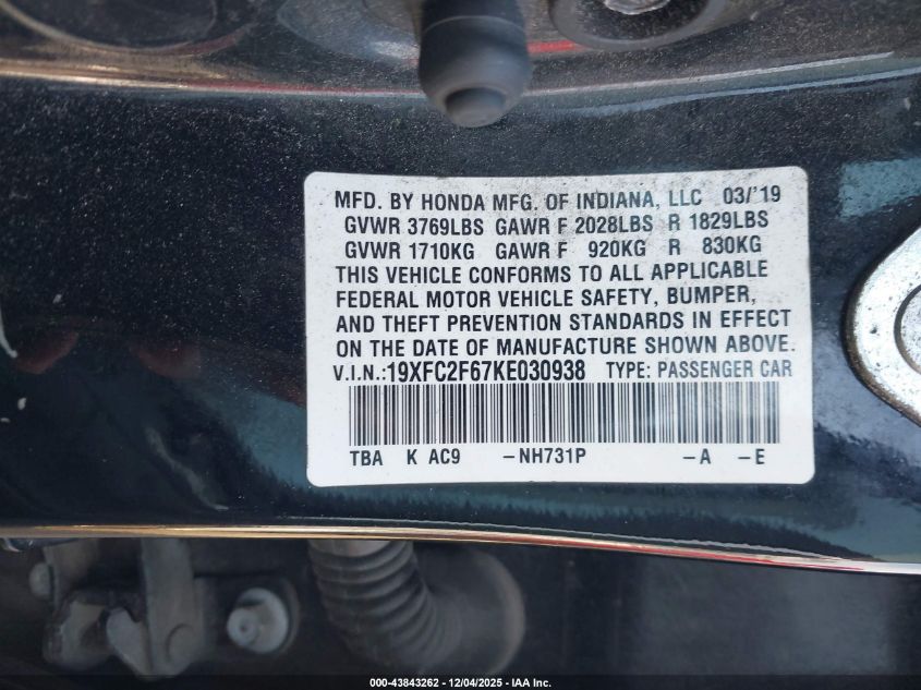 2019 HONDA CIVIC 2019 року Бензин, 2.0, Передний привод, vin - 19XFC2F67KE030938 из США