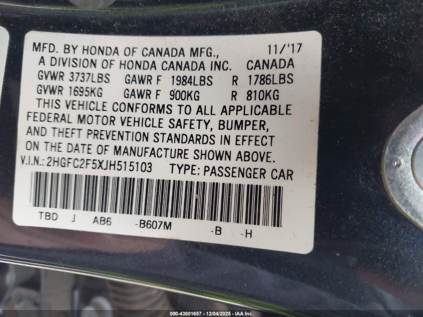 2018 HONDA CIVIC 2018 року Бензин, 2.0, Передний привод, vin - 2HGFC2F5XJH515103 из США