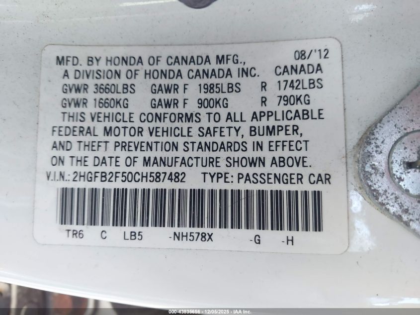 2012 HONDA CIVIC 2012 року Бензин, 1.8, Передний привод, vin - 2HGFB2F50CH587482 из США