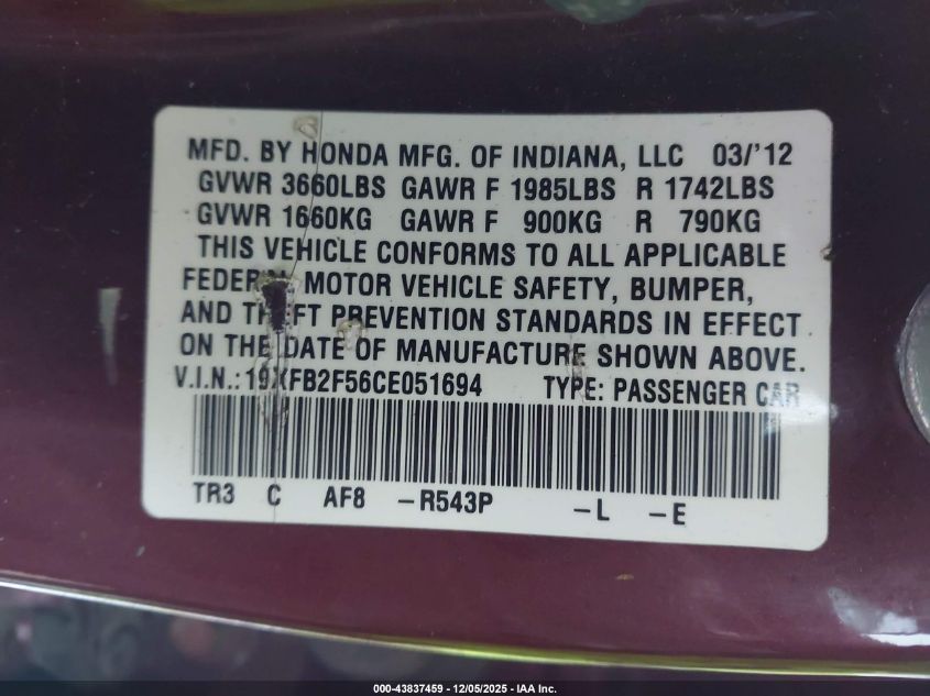 Цвет БургундияЦилиндры 4Привод Передний приводVIN 19XFB2F56CE051694Состояние Заводится и едет (проверено)Повреждения Передняя или задняя AutoRIA