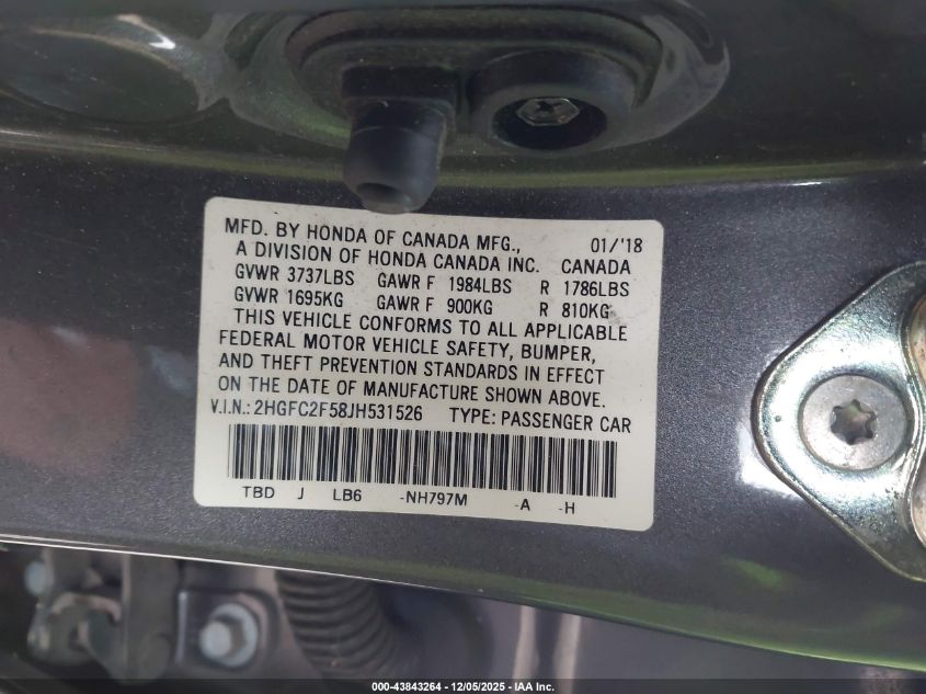 2018 HONDA CIVIC 2018 року Бензин, 2.0, Передний привод, vin - 2HGFC2F58JH531526 из США