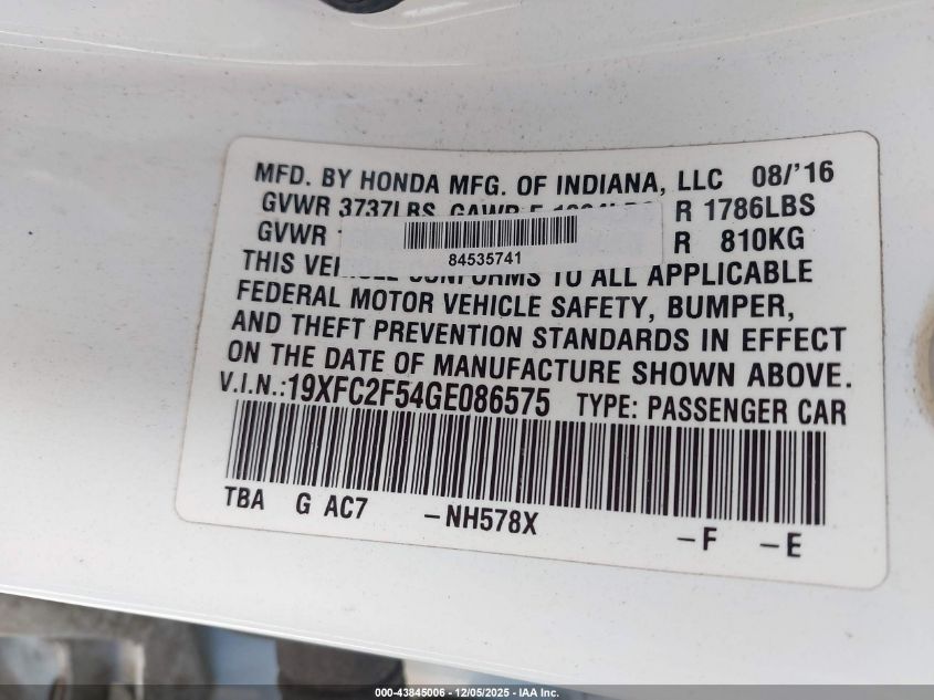 2016 HONDA CIVIC 2016 року Бензин, 2.0, Передний привод, vin - 19XFC2F54GE086575 из США