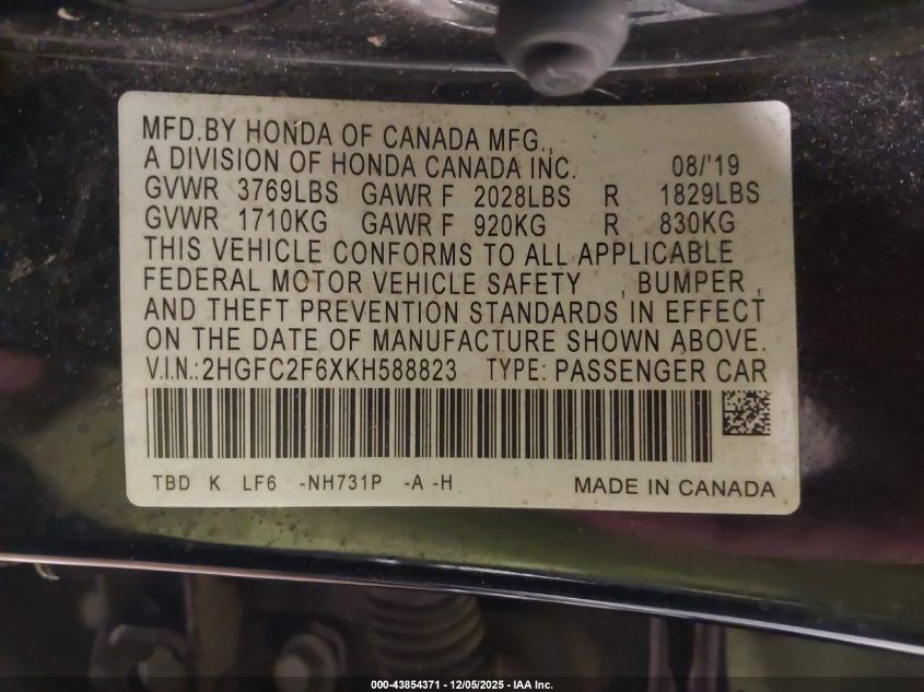 2019 HONDA CIVIC 2019 року Бензин, 2.0, Передний привод, vin - 2HGFC2F6XKH588823 из США