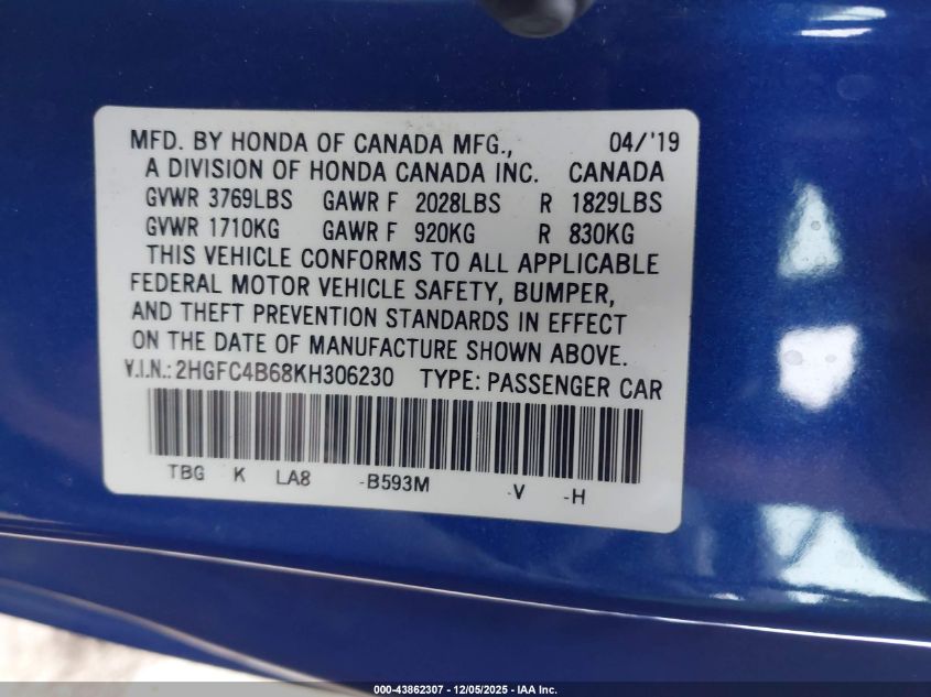 2019 HONDA CIVIC 2019 року Бензин, 2.0, Передний привод, vin - 2HGFC4B68KH306230 из США