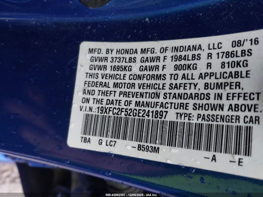 2016 HONDA CIVIC 2016 року Бензин, 2.0, Передний привод, vin - 19XFC2F52GE241897 из США