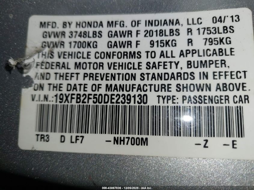 2013 HONDA CIVIC 2013 року Бензин, 1.8, Передний привод, vin - 19XFB2F50DE239130 из США