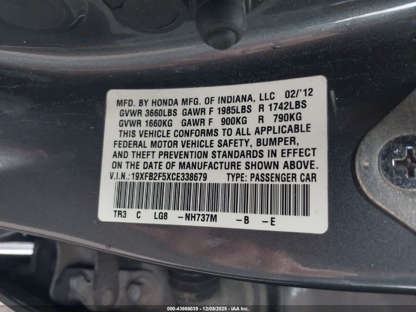2012 HONDA CIVIC 2012 року Бензин, 1.8, Передний привод, vin - 19XFB2F5XCE338679 из США