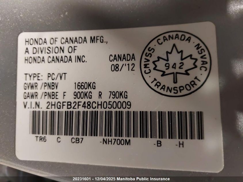 2012 HONDA CIVIC 2012 року Бензин, , Передний привод, vin - 2HGFB2F48CH050009 из США