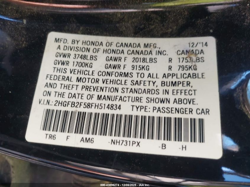 2015 HONDA CIVIC 2015 року Бензин, 1.8, Передний привод, vin - 2HGFB2F58FH514834 из США