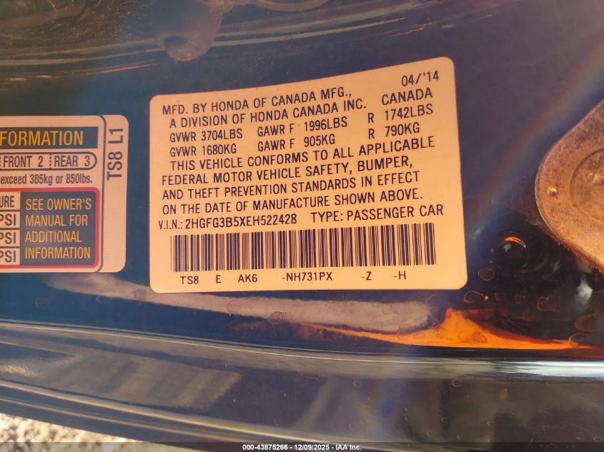 2014 HONDA CIVIC 2014 року Бензин, 1.8, Передний привод, vin - 2HGFG3B5XEH522428 из США