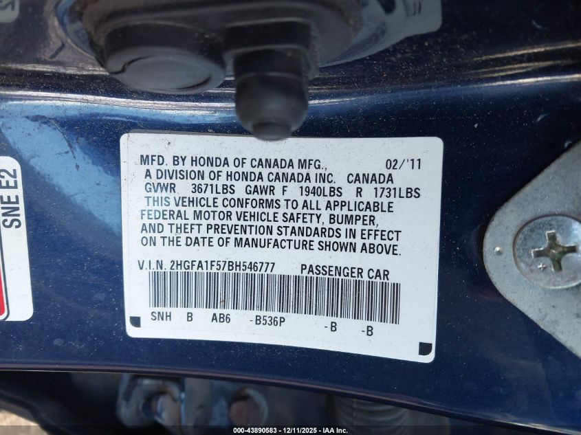 2011 HONDA CIVIC 2011 року Бензин, 1.8, Передний привод, vin - 2HGFA1F57BH546777 из США