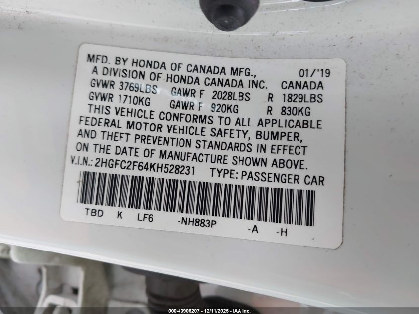 2019 HONDA CIVIC 2019 року Бензин, 2.0, Передний привод, vin - 2HGFC2F64KH528231 из США