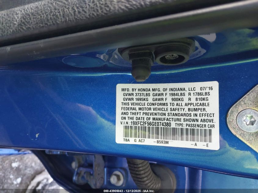 2016 HONDA CIVIC 2016 року Бензин, 2.0, Передний привод, vin - 19XFC2F56GE074380 из США