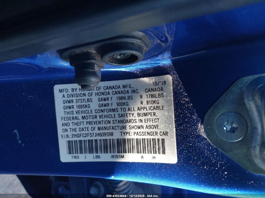 2018 HONDA CIVIC 2018 року Бензин, 2.0, Передний привод, vin - 2HGFC2F57JH609598 из США