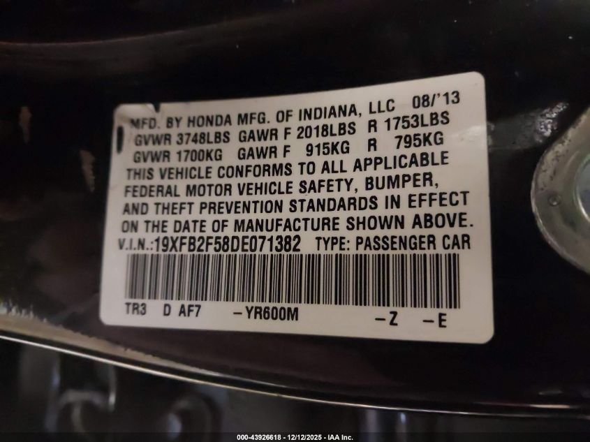 2013 HONDA CIVIC 2013 року Бензин, 1.8, Передний привод, vin - 19XFB2F58DE071382 из США