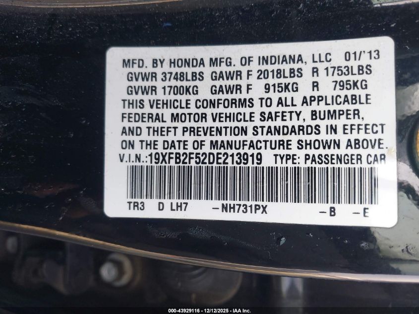 Цвет ЧерныйЦилиндры 4Привод Передний приводVIN 19XFB2F52DE213919Состояние Заводится и едет (проверено)Повреждения Передняя или задняя AutoRIA
