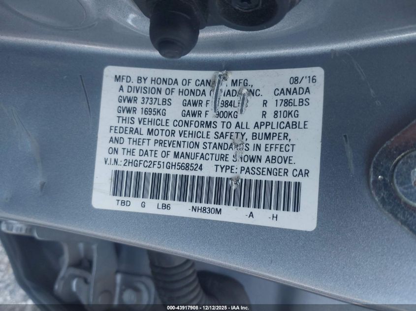2016 HONDA CIVIC 2016 року Бензин, 2.0, Передний привод, vin - 2HGFC2F51GH568524 из США