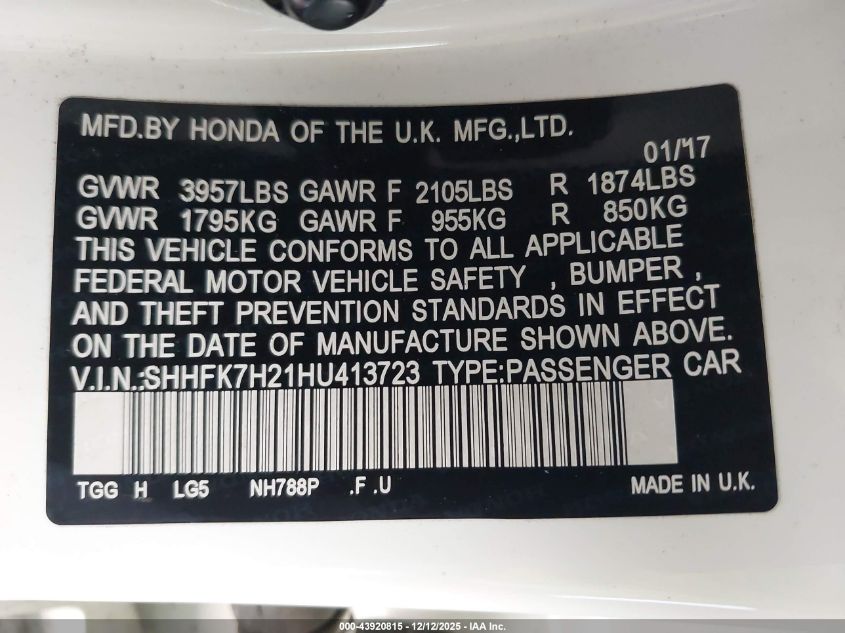 2017 HONDA CIVIC 2017 року Бензин, 1.5, Передний привод, vin - SHHFK7H21HU413723 из США