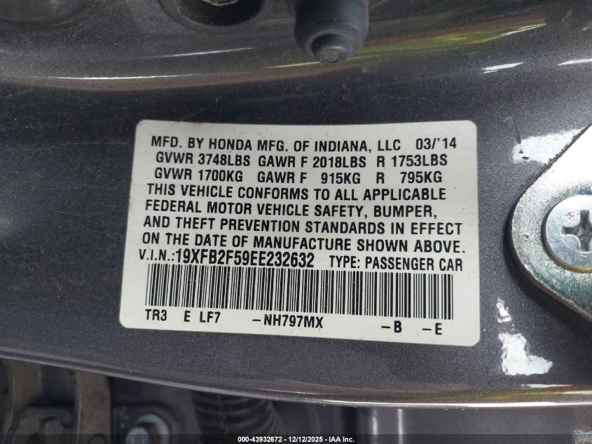 2014 HONDA CIVIC 2014 року Бензин, 1.8, Передний привод, vin - 19XFB2F59EE232632 из США