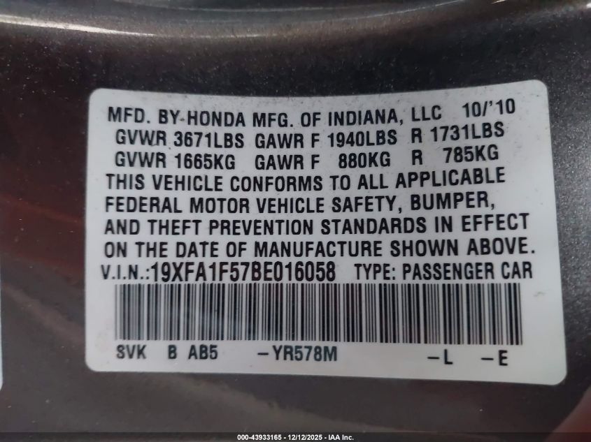 2011 HONDA CIVIC 2011 року Бензин, 1.8, Передний привод, vin - 19XFA1F57BE016058 из США