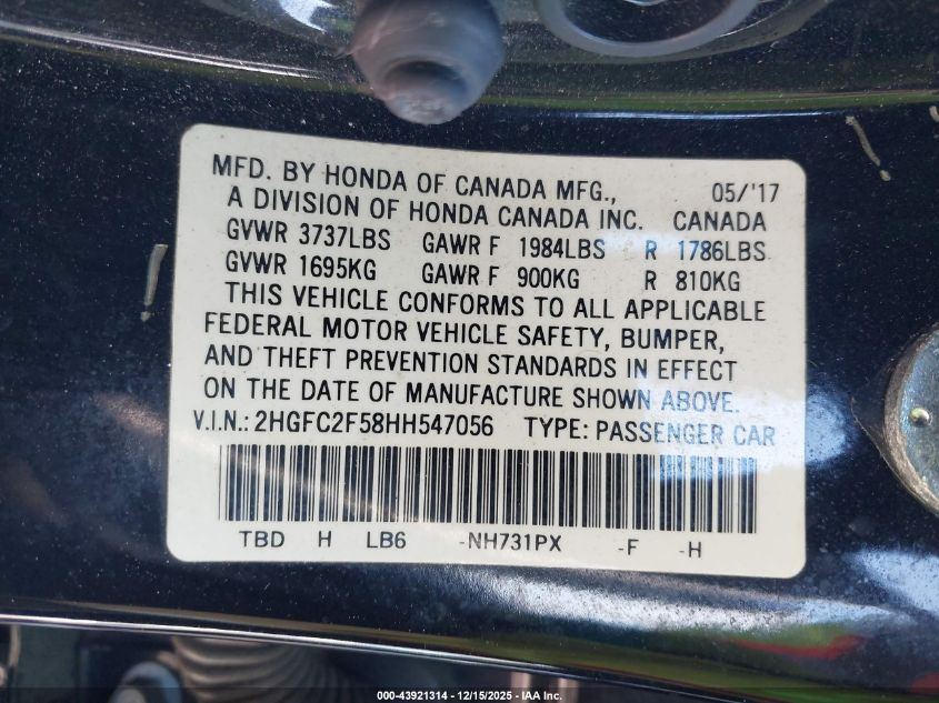 2017 HONDA CIVIC 2017 року Бензин, 2.0, Передний привод, vin - 2HGFC2F58HH547056 из США