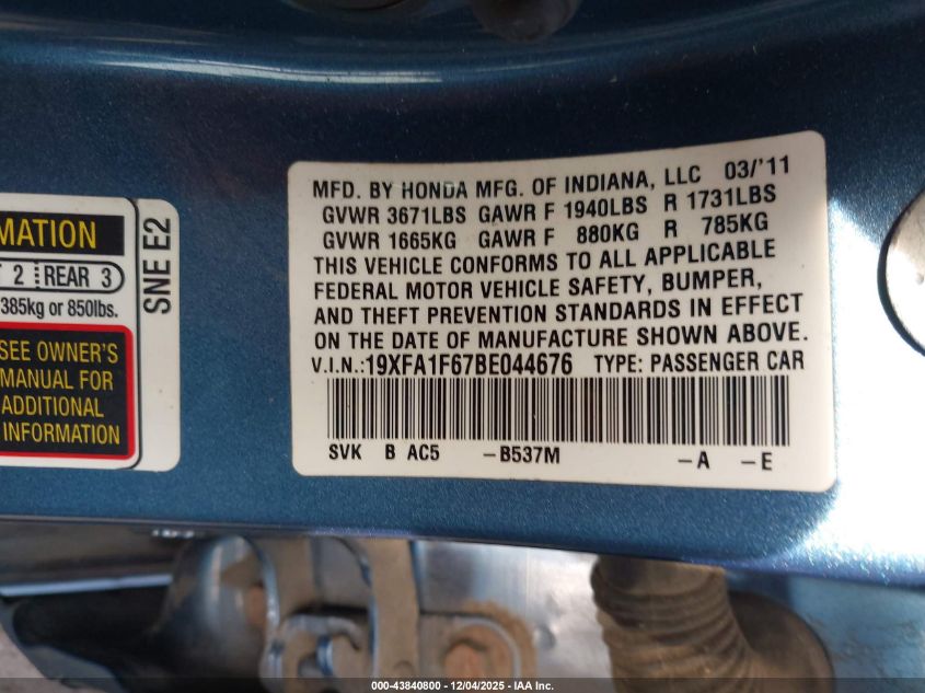 2011 HONDA CIVIC 2011 року Бензин, 1.8, Передний привод, vin - 19XFA1F67BE044676 из США