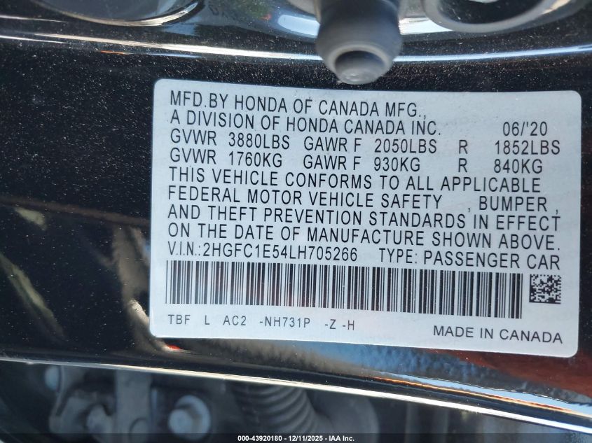 2020 HONDA CIVIC 2020 року Бензин, 1.5, Передний привод, vin - 2HGFC1E54LH705266 из США