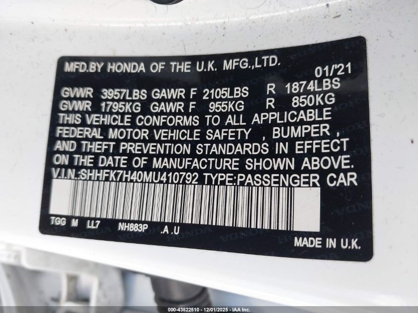 2021 HONDA CIVIC 2021 року Бензин, 1.5, Передний привод, vin - SHHFK7H40MU410792 из США