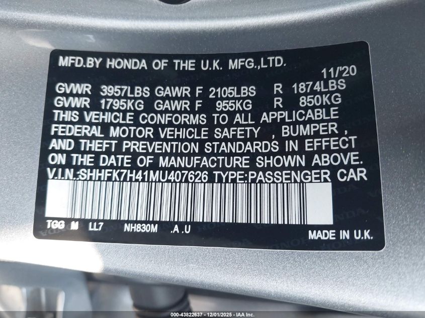 2021 HONDA CIVIC 2021 року Бензин, 1.5, Передний привод, vin - SHHFK7H41MU407626 из США