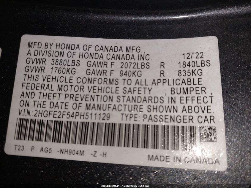 2023 HONDA CIVIC 2023 року Бензин, 2.0, Передний привод, vin - 2HGFE2F54PH511129 из США
