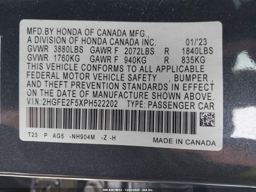 2023 HONDA CIVIC 2023 року Бензин, 2.0, Передний привод, vin - 2HGFE2F5XPH522202 из США