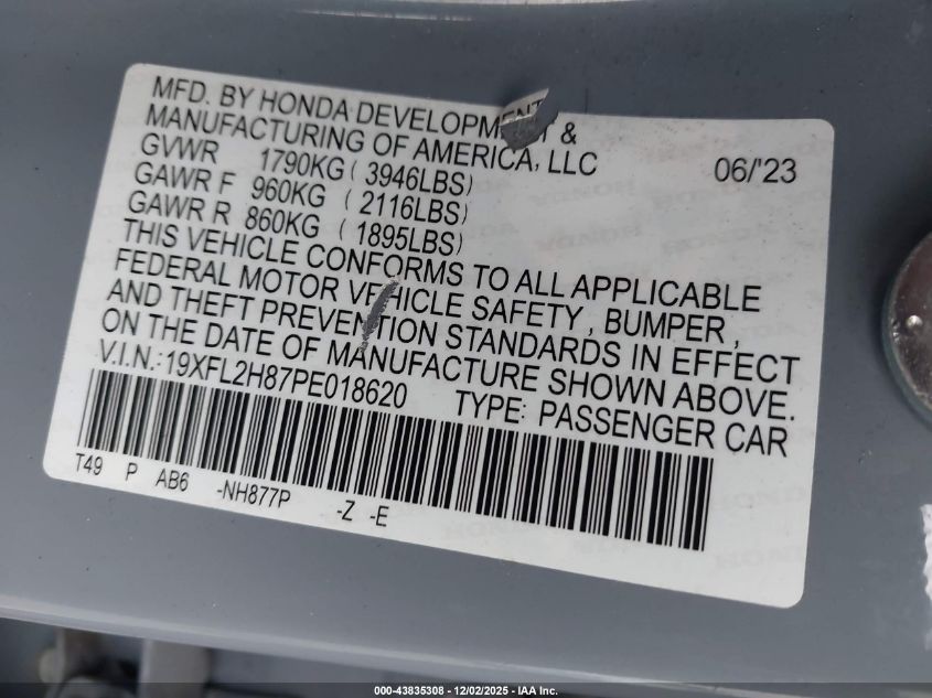 2023 HONDA CIVIC 2023 року Бензин, 2.0, Передний привод, vin - 19XFL2H87PE018620 из США