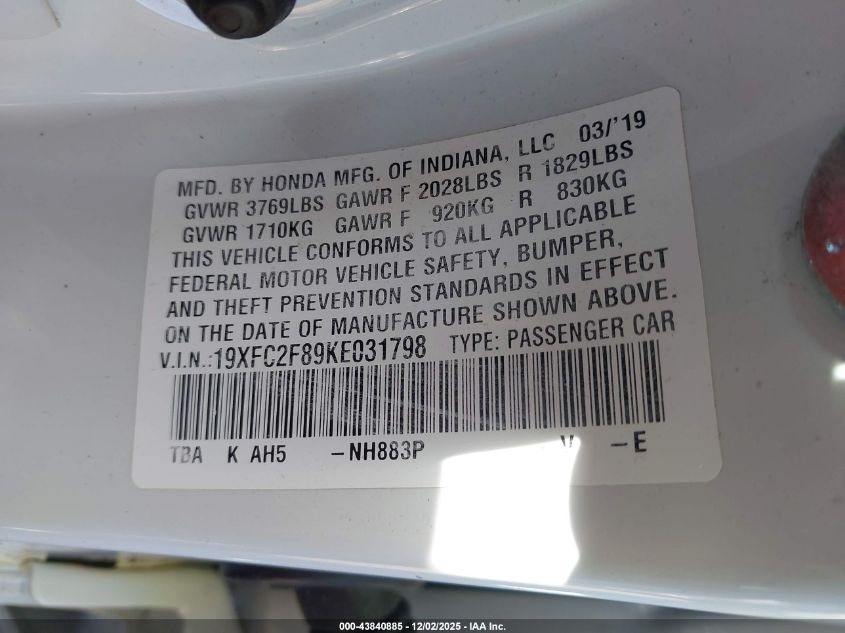 2019 HONDA CIVIC 2019 року Бензин, 2.0, Передний привод, vin - 19XFC2F89KE031798 из США