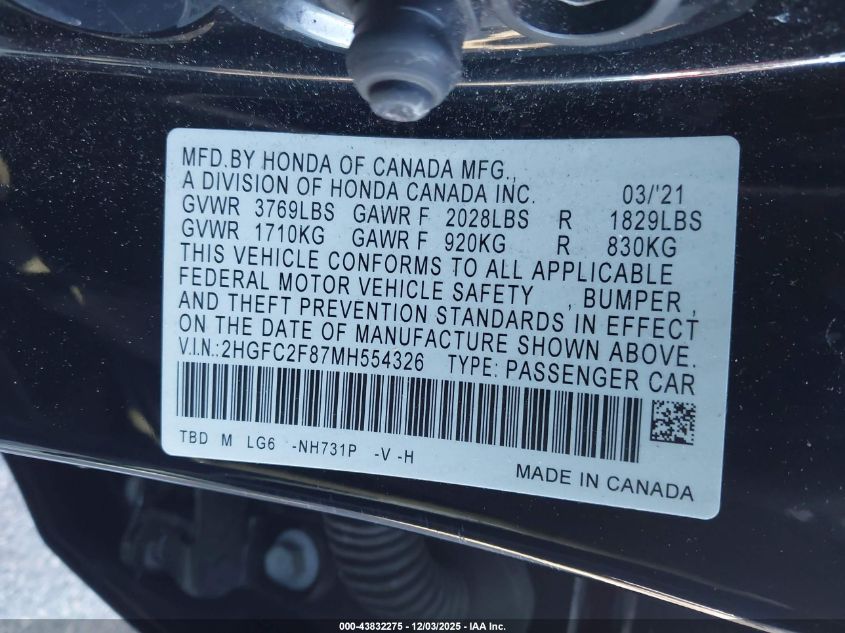 2021 HONDA CIVIC 2021 року Бензин, 2.0, Передний привод, vin - 2HGFC2F87MH554326 из США