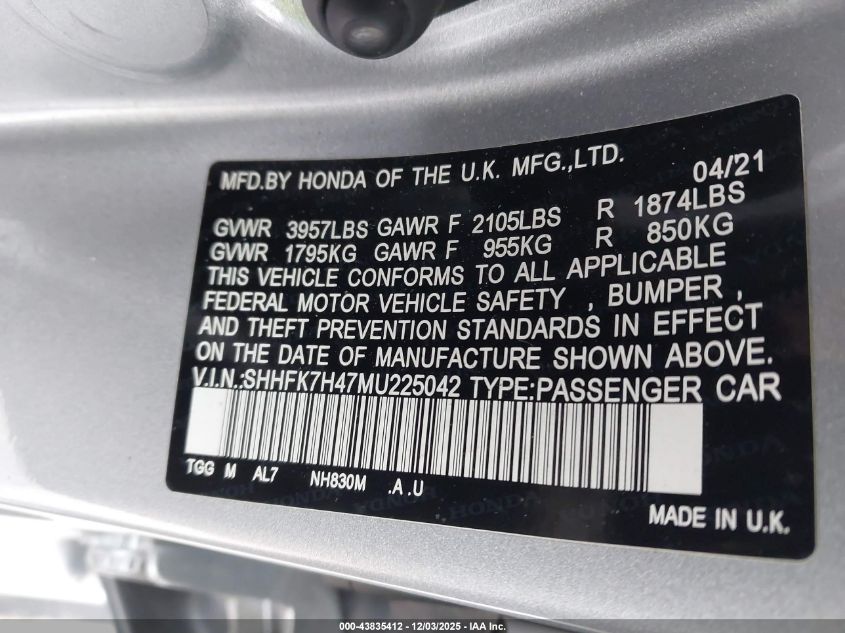 2021 HONDA CIVIC 2021 року Бензин, 1.5, Передний привод, vin - SHHFK7H47MU225042 из США