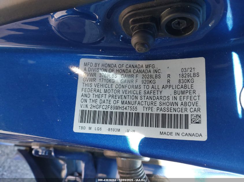 2021 HONDA CIVIC 2021 року Бензин, 2.0, Передний привод, vin - 2HGFC2F89MH547555 из США