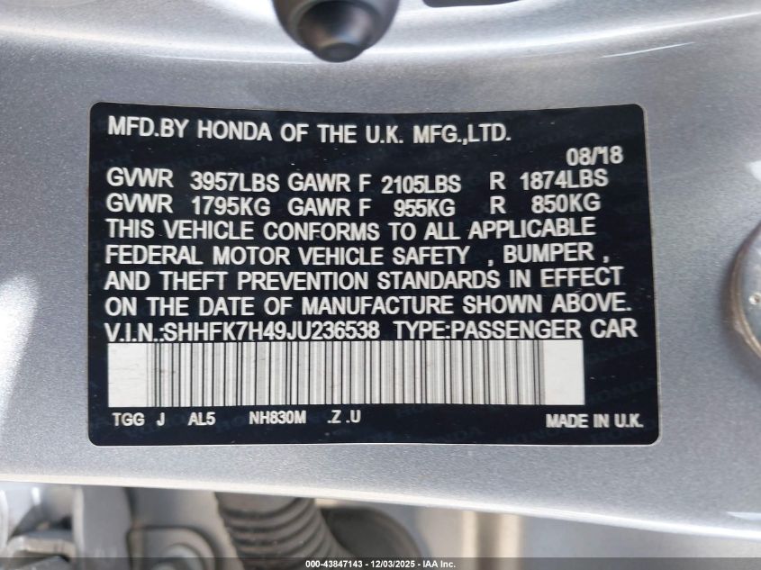 2018 HONDA CIVIC 2018 року Бензин, 1.5, Передний привод, vin - SHHFK7H49JU236538 из США