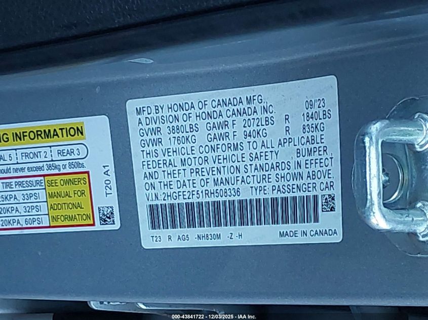 2024 HONDA CIVIC 2024 року Бензин, 2.0, Передний привод, vin - 2HGFE2F51RH508336 из США