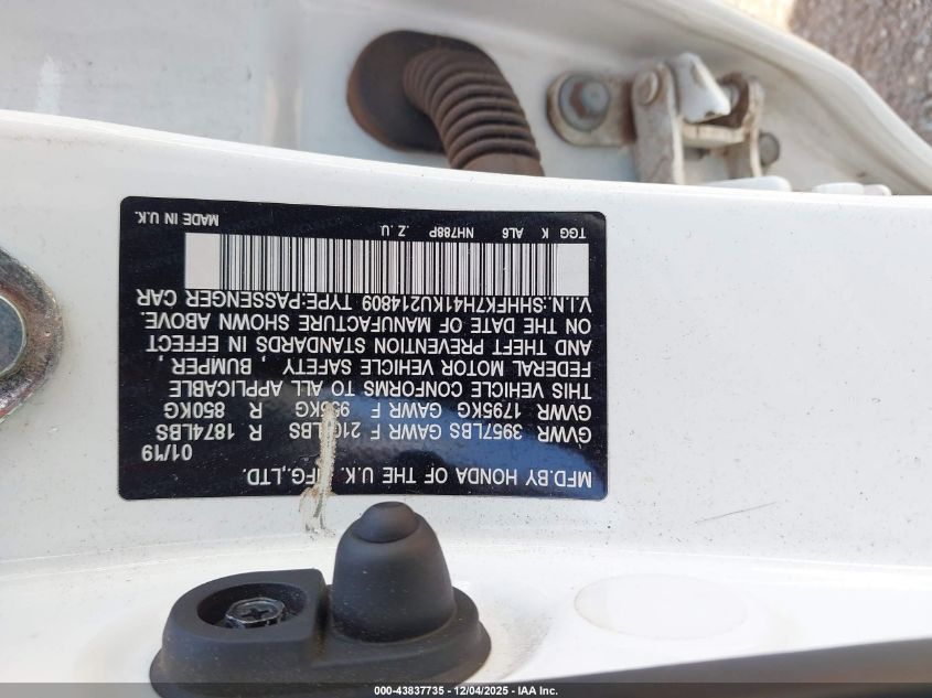 2019 HONDA CIVIC 2019 року Бензин, 1.5, Передний привод, vin - SHHFK7H41KU214809 из США