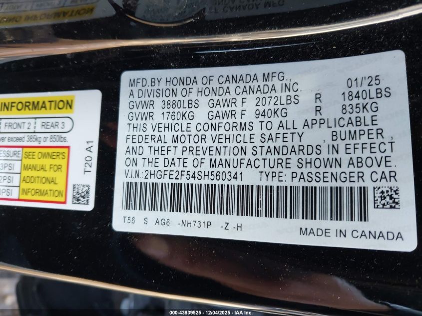 2025 HONDA CIVIC 2025 року Бензин, 2.0, Передний привод, vin - 2HGFE2F54SH560341 из США