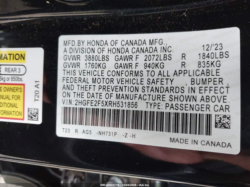 2024 HONDA CIVIC 2024 року Бензин, 2.0, Передний привод, vin - 2HGFE2F5XRH531856 из США