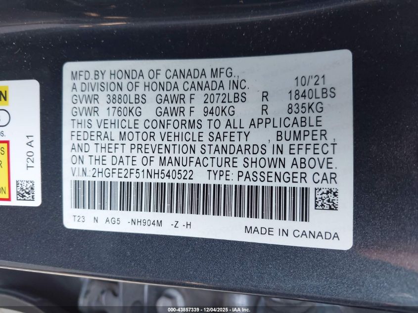 2022 HONDA CIVIC 2022 року Бензин, 2.0, Передний привод, vin - 2HGFE2F51NH540522 из США
