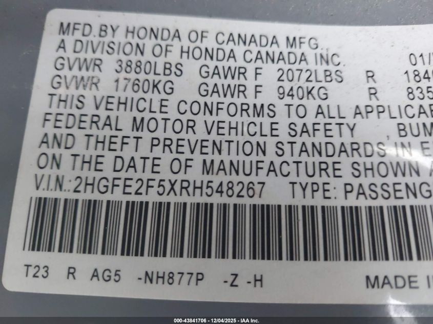 2024 HONDA CIVIC 2024 року Бензин, 2.0, Передний привод, vin - 2HGFE2F5XRH548267 из США