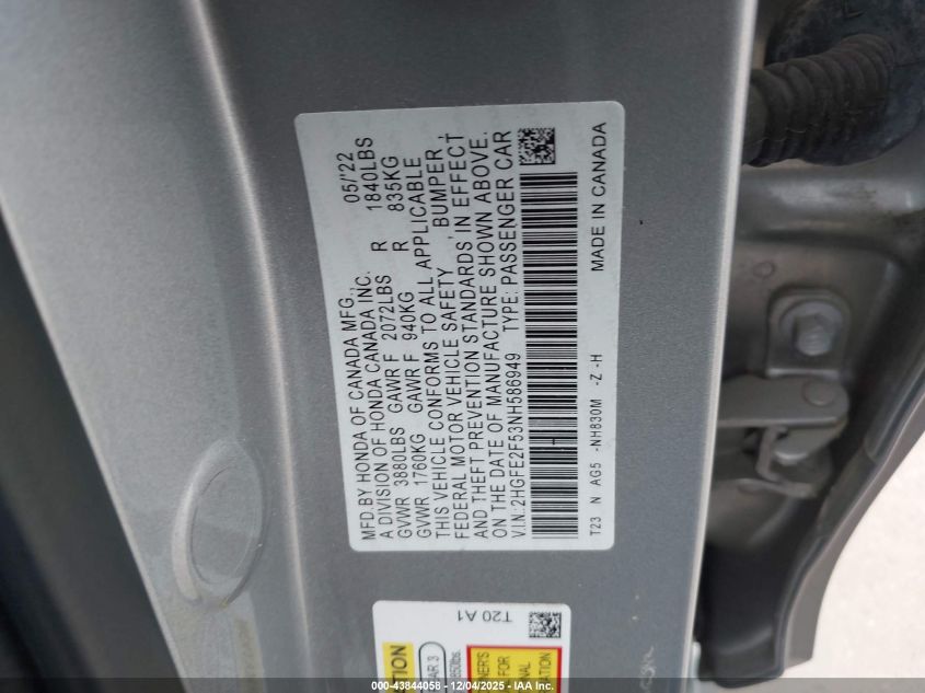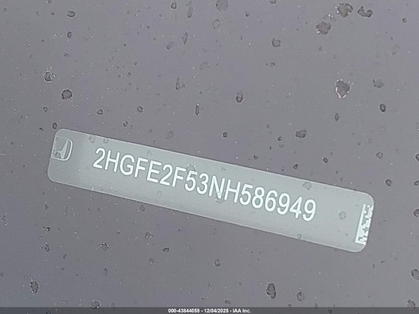 2022 HONDA CIVIC 2022 року Бензин, 2.0, Передний привод, vin - 2HGFE2F53NH586949 из США
