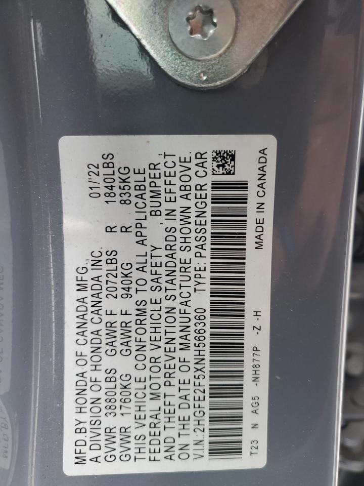 2022 HONDA CIVIC 2022 року Бензин, 2.0, , vin - 2HGFE2F5XNH566360 из США