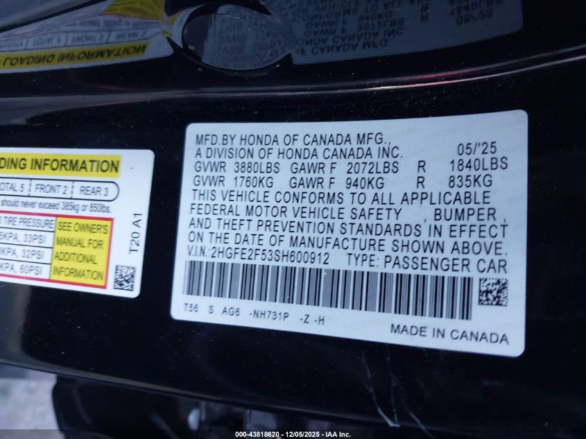 2025 HONDA CIVIC 2025 року Бензин, 2.0, Передний привод, vin - 2HGFE2F53SH600912 из США