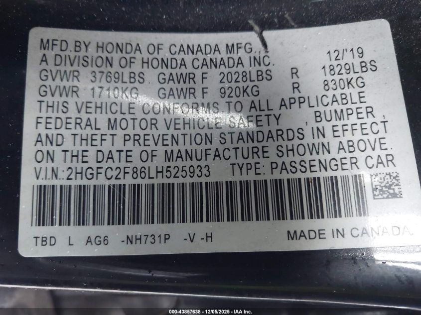 2020 HONDA CIVIC 2020 року Бензин, 2.0, Передний привод, vin - 2HGFC2F86LH525933 из США