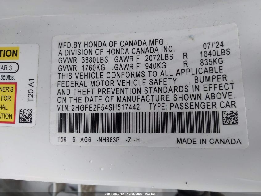 2025 HONDA CIVIC 2025 року Бензин, 2.0, Передний привод, vin - 2HGFE2F54SH517442 из США
