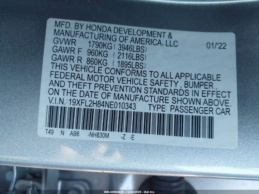 2022 HONDA CIVIC 2022 року Бензин, 2.0, Передний привод, vin - 19XFL2H84NE010343 из США
